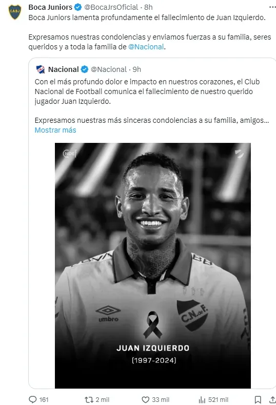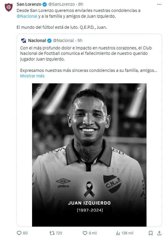 El mundo del fútbol está conmocionado por la muerte de Juan Izquierdo. El jugador de Nacional, que el jueves 22 de agosto se descompensó en pleno partido de CONMEBOL Libertadores ante San Pablo por una arritmia cardíaca, falleció el último martes en tierras brasileñas.