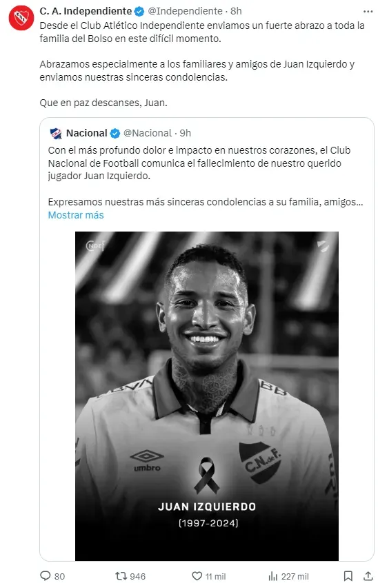 La noticia sacudió a todos los que forman parte de este deporte y el fútbol argentino no fue la excepción. Jugadores, dirigentes y clubes se pronunciaron apenas se confirmó la muerte del futbolista de 27 años. De hecho, hay varios excompañeros de Izquierdo jugando en la Liga Profesional.