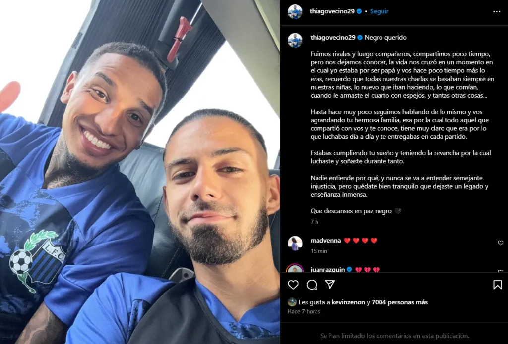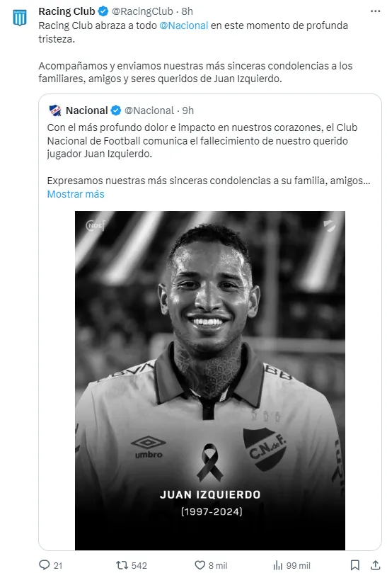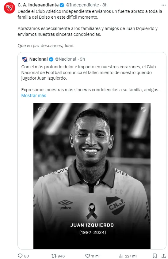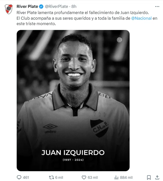 En cuanto a los deportistas, Agustín Sant’Anna (River), Gastón Martirena (Racing), Thiago Vecino (Vélez) y Mauro Méndez (Estudiantes), que compartieron plantel con Izquierdo, también le dedicaron unas palabras. A continuación, todos los mensajes de despedida desde el fútbol argentino.