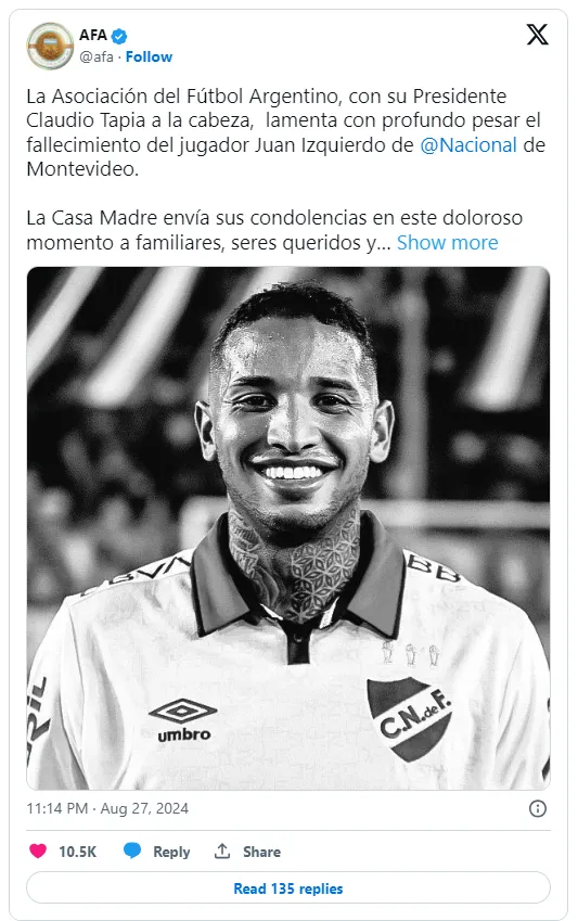 Los 5 grandes del fútbol local no tardaron en realizar publicaciones en las redes enviándole fuerzas a la familia del jugador. La Asociación del Fútbol Argentino y Claudio Tapia, a través de su cuenta personal, también dejaron un mensaje al respecto.