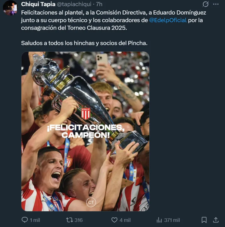 “Felicitaciones al plantel, a la Comisión Directiva, a Eduardo Domínguez junto a su cuerpo técnico y los colaboradores de Estudiantes de La Plata por la consagración del Torneo Clausura 2025. Saludos a todos los hinchas y socios del Pincha“, compartió Tapia en su cuenta de X. La misma acumula más de 370 mil visualizaciones con más de mil comentarios, 300 reposteos y 4 mil me gusta.