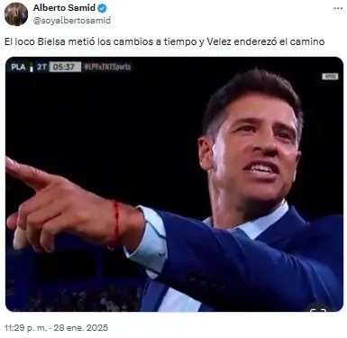 En un tuit lleno de sarcasmo disparó: “El loco Bielsa metió los cambios a tiempo y Vélez enderezó el camino”. Así, sumó un nuevo capítulo en cuanto a chicanas al exfutbolista de Newell’s, Estudiantes y Vélez, entre otros. No solo se burló de sus resultados al frente del Fortín, sino que también lo hacía durante su breve paso por Tigre,