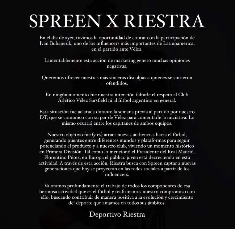 Deportivo Riestra realizó una polémica acción de marketing en el partido ante Vélez del pasado lunes al darse el debut profesional del streamer Spreen, con quien el club de Villa Soldati comparte sponsor. El estreno de Iván Buhajeruk como futbolista, jugando solo un minuto, logró repercusión mundial y controversia, al punto tal que desde la institución se vieron obligados a pedir disculpas.