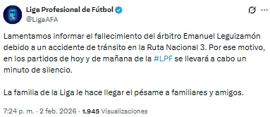 “Lamentamos informar el fallecimiento del árbitro Emanuel Leguizamón debido a un accidente de tránsito en la Ruta Nacional 3. Por ese motivo, en los partidos de hoy y de mañana de la Liga Profesional de Fútbol se llevará a cabo un minuto de silencio. La familia de la Liga le hace llegar el pésame a familiares y amigos”, anunció la LPF.