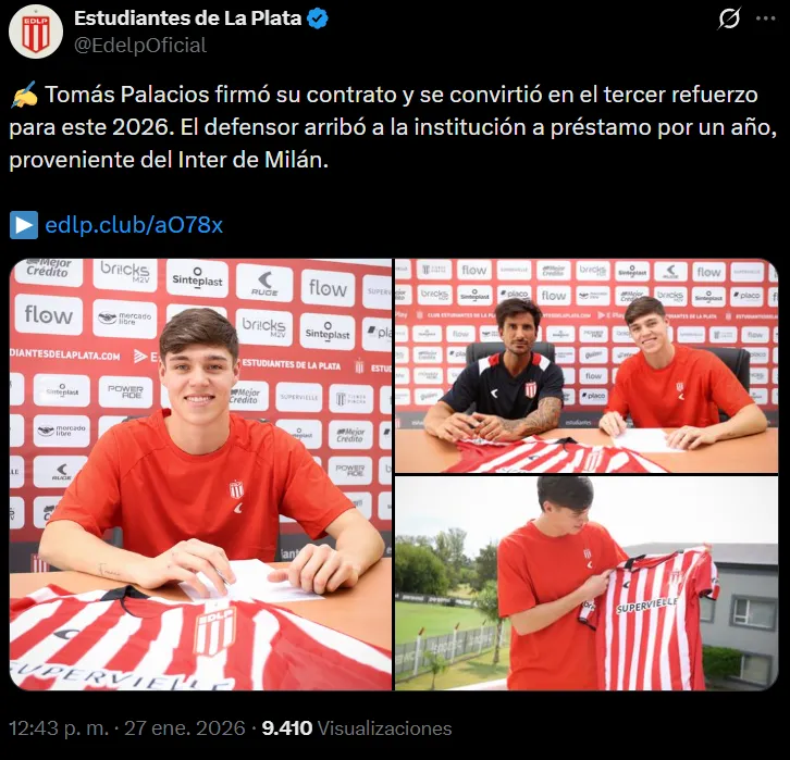 El Pincha confirmó la llegada a préstamo del defensor de 22 años que es propiedad de Inter de Milán, por un año y con opción de compra.