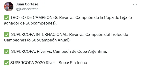 La última actualización la brindó el periodista de TyC Sports, Juan Cortese, a la hora de repasar las finales que todavía debe disputar el Millonario: “Sin fecha”. Se espera por la pronunciación de la Asociación del Fútbol Argentino para conocer los detalles definitivos del Boca – River que dará un nuevo campeón en el fútbol argentino.