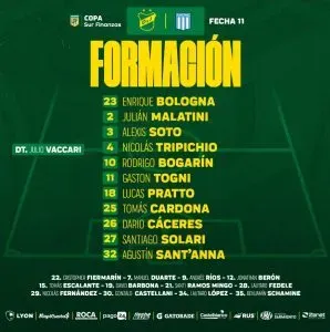 La dupla Videla-Grazzini confirmó los XI que visitarán a Defensa esta noche: Gabriel Arias; Facundo Mura, Leonardo Sigali, Gonzalo Piovi, Gabriel Rojas, Agustín Almendra, Aníbal Moreno, Juan Ignacio Nardoni, Jonatan Gómez; Gabriel Hauche, Roger Martínez y Baltasar Rodríguez.