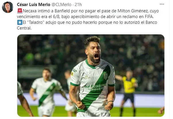 Desde los Rayos le reclaman al Taladro la falta de pago por Milton Giménez, delantero que llegó cedido al club a inicios de año. Ese reclamo tomó curso legal y se transformó en intimación, debido a que el pasado sábado se cumplió el plazo en el que Banfield podía pagar por el futbolista.