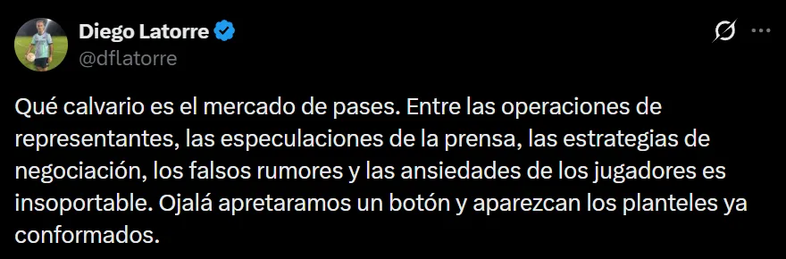 - Diego Latorre calificó el actual mercado de pases como insoportable en sus redes sociales.