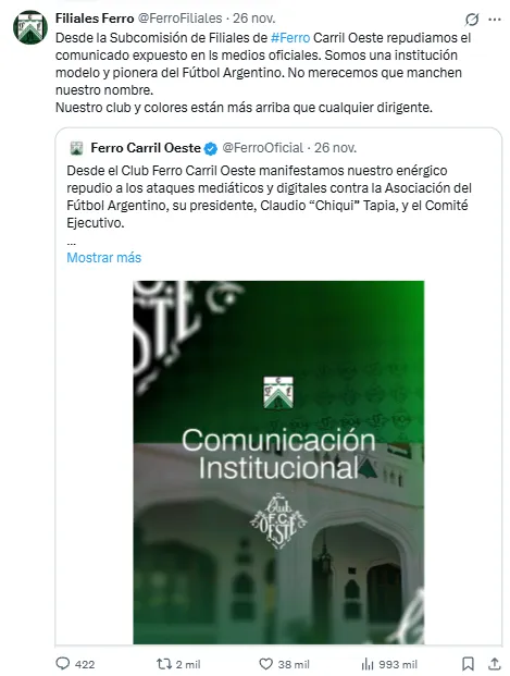 - La Subcomisión de Filiales de Ferro repudió el comunicado del club en una publicación con más interacciones.