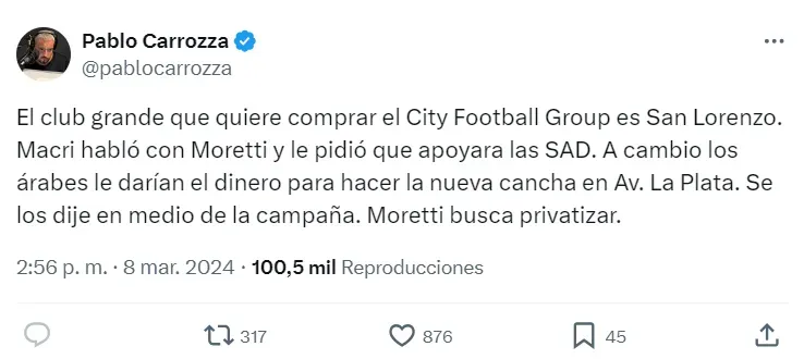 “Macri habló con Moretti y le pidió que apoyara las SAD. A cambio, los árabes le darían el dinero para hacer la nueva cancha en Avenida La Plata. Se los dije en medio de la campaña. Moretti busca privatizar”, sentenció Carrozza en un posteo que generó muchas interacciones en pocos minutos.