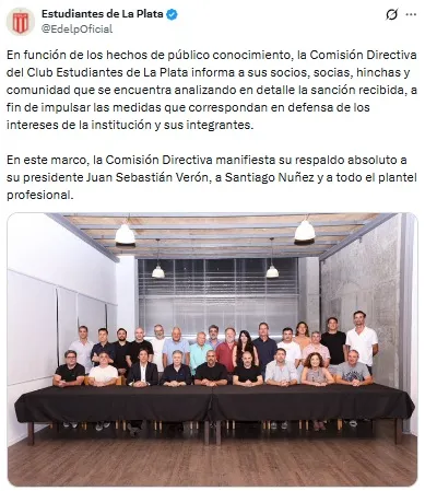 “En función de los hechos de público conocimiento, la Comisión Directiva del Club Estudiantes de La Plata informa a sus socios, socias, hinchas y comunidad que se encuentra analizando en detalle la sanción recibida, a fin de impulsar las medidas que correspondan en defensa de los intereses de la institución y sus integrantes”, inició el mensaje.