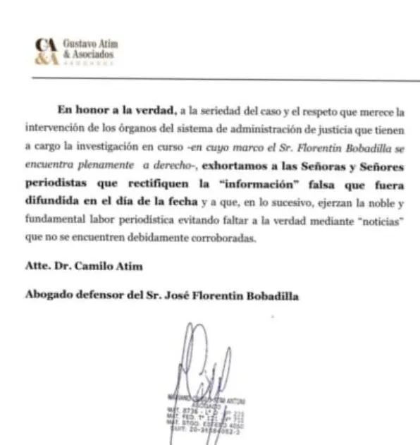 En honor a la verdad, a la seriedad del caso y el respeto que merece la intervención de los órganos del sistema de administración de justicia que tienen a cargo la investigación en curso – en cuyo marco el Sr. Florentín Bobadilla se encuentra plenamente a derecho – exhortamos a las Señoras y Señores periodistas que rectifiquen la “información” falsa que fuera difundida en el día de la fecha y a que, en lo sucesivo, ejerzan la noble y fundamental labor periodística evitando faltar a la verdad mediante “noticias” que no se encuentren debidamente corroboradas.