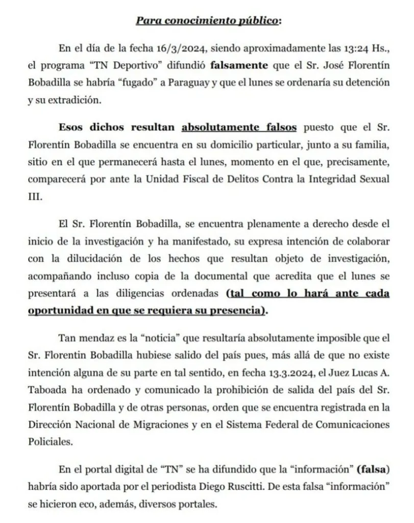 En el día de la fecha 16/3/2024, siendo aproximadamente a las 13:24 horas, el programa TN Deportivo difundió falsamente que el Sr. José Florentín Bobadilla se habría “fugado” a Paraguay y que el lunes se ordenaría su detención y su extradición.