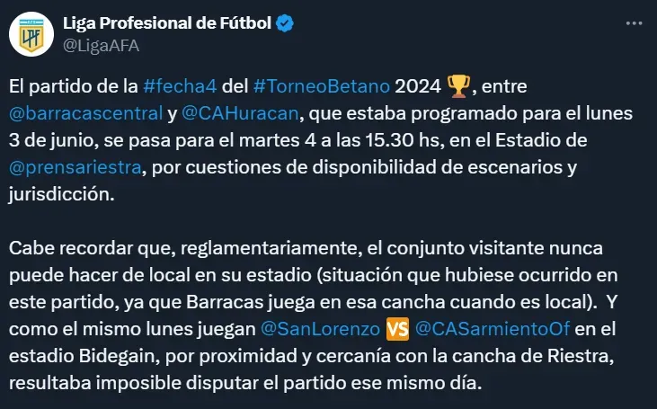 Esta modificación de lunes a martes tiene que ver con que, el 3 de junio, San Lorenzo de Almagro recibirá a Sarmiento de Junín en el Nuevo Gasómetro. Por ende, por proximidad y cercanía con la cancha de Deportivo Riestra, resultaba imposible disputar ambos partidos durante la misma jornada. Por ello, la naturaleza del cambio de fecha.