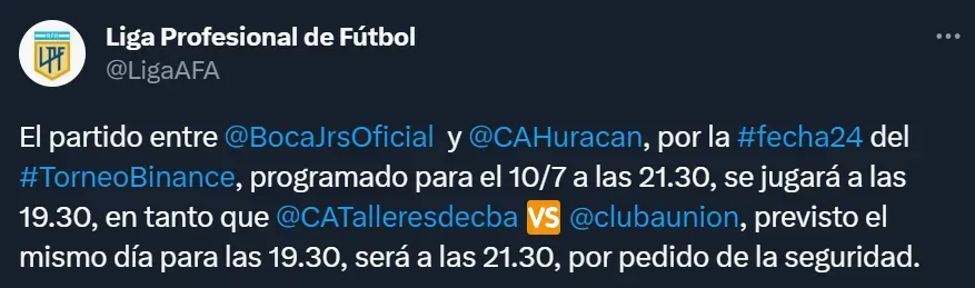 A lo largo de las últimas horas, a través de las redes sociales de la Liga Profesional, se confirmó que “por pedido de la seguridad” el partido deberá adelantarse a las 19:30 horas, por lo que solamente será Talleres – Unión el encuentro que se dispute a última hora.