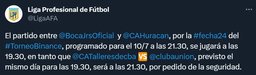 A lo largo de las últimas horas, a través de las redes sociales de la Liga Profesional, se confirmó que “por pedido de la seguridad” el partido deberá adelantarse a las 19:30 horas, por lo que solamente será Talleres Unión el encuentro que se dispute a última hora.