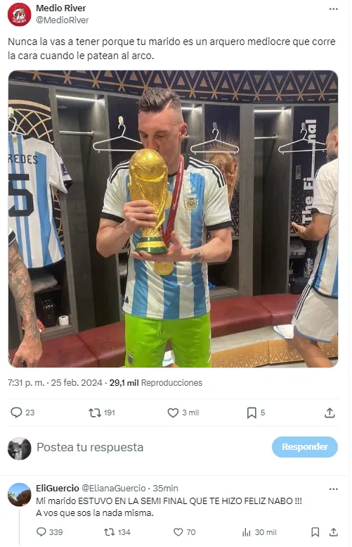 Pero la polémica de la modelo no terminó allí. Cientos de respuestas cayeron sobre su publicación original y allí se produjo un enfrentamiento con seguidores del Millonario. Uno de ellos posteó una foto de Armani con la Copa del Mundo y le dijo: “Nunca la vas a tener porque tu marido es un arquero mediocre que corre la cara cuando le patean al arco“.