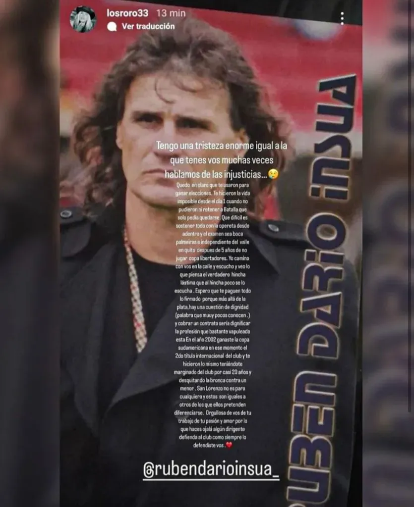 “Cobrar un contrato sería dignificar la profesión que bastante vapuleada está. En el año 2002 ganaste la Copa Sudamericana. En ese momento, el segundo título internacional del club y te hicieron lo mismo, teniéndote marginado del club por casi 20 años y desquitando la bronca contra un menor. San Lorenzo no es para cualquiera y estos son iguales a otros de los que ellos pretenden diferenciarse. Orgullosa de vos, de tu trabajo, de tu pasión y amor por lo que hacés. Ojalá algún dirigente defienda al club como siempre lo defendiste vos“, cerró.