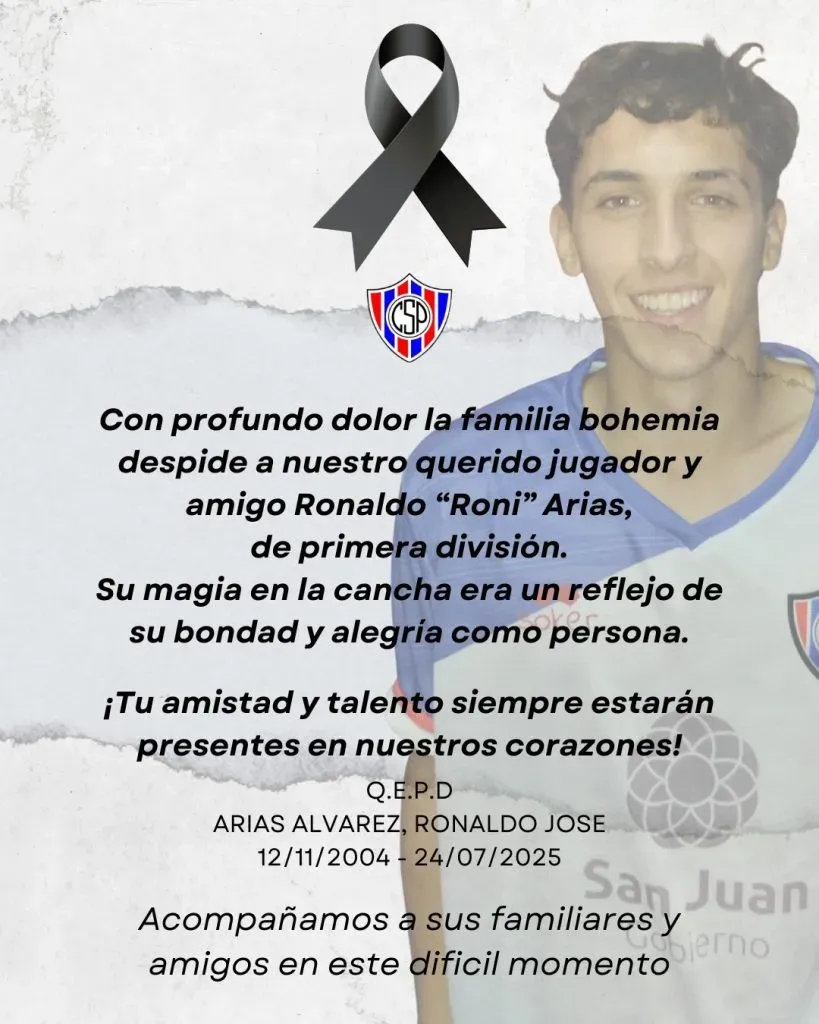 “Con profundo dolor y pesar, la familia bohemia se despide de su jugador de primera división, Ronaldo Roni José Arias Álvarez. Excelente jugador y persona, con una gran carrera futbolística, pero sobre todo con un gran corazón. Un joven alegre, responsable, compañero y apasionado por el fútbol”, fue el mensaje.