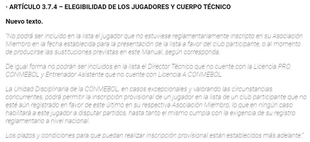Dentro del reglamento de CONMEBOL para todos los campeonatos que organice la entidad, aparece el Artículo 3.7.4 que se refiere a la eligibilidad de los jugadores y cuerpo técnico. Si bien destaca que “no podrá ser incluido en la lista el jugador que no estuviese reglamentariamente inscripto en su Asociación Miembro en la fecha establecida para la presentación de la lista a favor del club participante, o al momento de producirse las sustituciones previstas en este Manual, según corresponda. De igual forma no podrán ser incluidos en la lista el Director Técnico que no cuente con la Licencia PRO CONMEBOL y Entrenador Asistente que no cuente con Licencia A CONMEBOL”, hay una parte de la norma que le permite a Racing poder inscribir a Almendra.