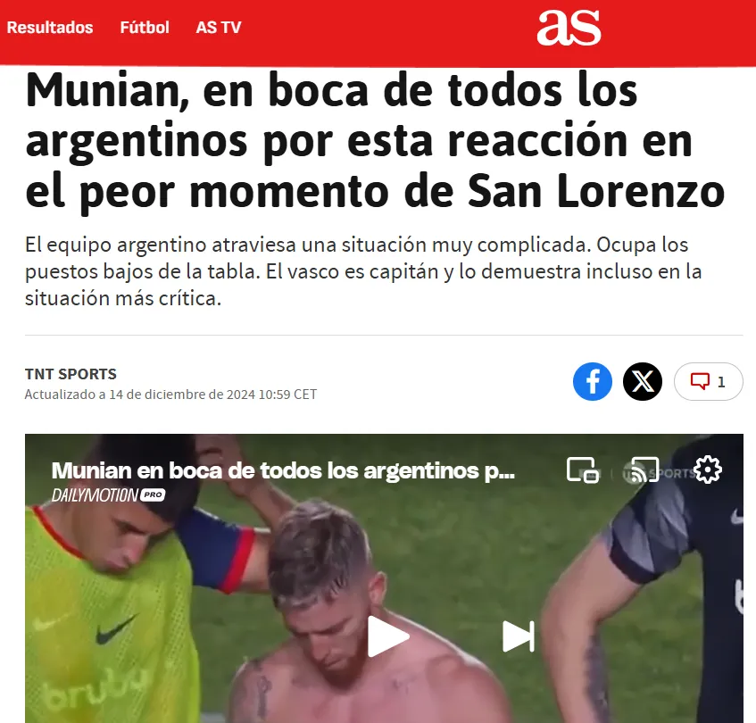 Este sábado, este gesto de Muniain llegó a la prensa española, más precisamente al portal del diario As, uno de los más populares del país. “El equipo argentino atraviesa una situación muy complicada. Ocupa los puestos bajos de la tabla. El vasco es capitán y lo demuestra incluso en la situación más crítica”, se puedo leer en As, acompañado del video del momento.