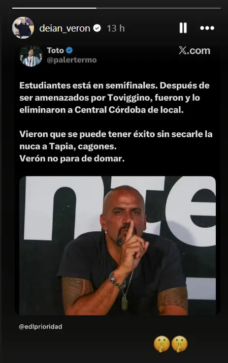 El usuario @palertermo compartió un tuit que dice: “Estudiantes está en semifinales. Después de ser amenazados por Toviggino, fueron y lo eliminaron a Central Córdoba de local. Vieron que se puede tener éxito sin secarle la nuca a Tapia, cagones. Verón no para de domar“, acompañado de una foto de la Bruja haciendo el gesto de callarse la boca.