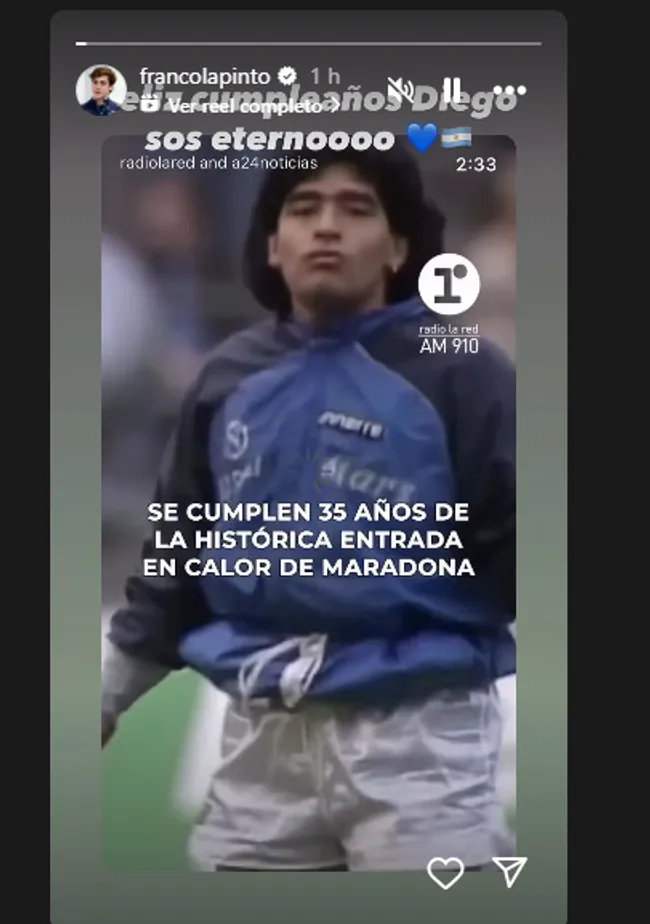 La leyenda “Feliz cumpleaños Diego, sos eterno“, un corazón y una bandera argentina. Ese fue el mensaje que dejó Colapinto en una historia en su cuenta personal de Instagram, acompañado de un reel recordando su mítica entrada en calor con Napoli al ritmo de ‘Live Is Life’ de Opus, en un video que ya forma parte de la historia del fútbol mundial.