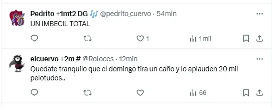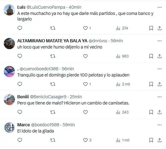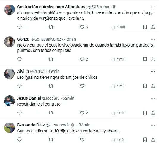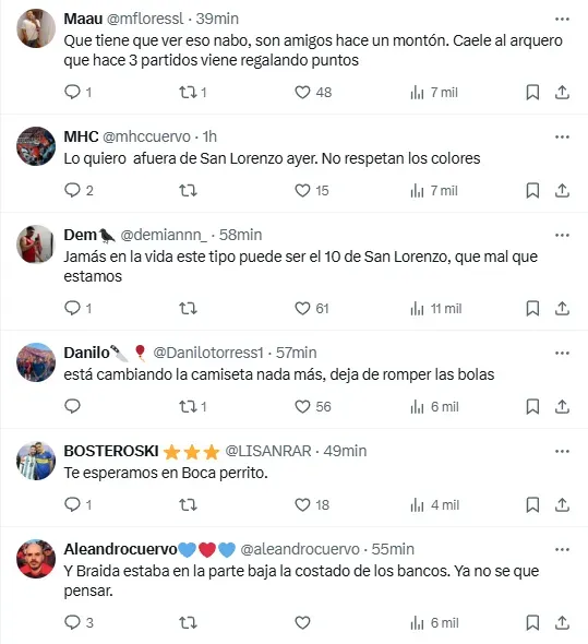 Ante la viralización del video, aparecieron comentarios como “rescíndanle en contrato”, “que salga a pedir disculpas ya”, “lo quiero afuera de San Lorenzo ayer”, “no respetan los colores”, “qué mal estamos”, entre otras quejas que los hinchas le hicieron al n°10 de San Lorenzo virtualmente tras la caída en la Bombonera.