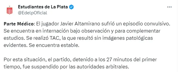 A los 27 minutos del primer tiempo, el partido que disputaban Estudiantes de La Plata y Boca por la fecha 11 del Grupo B de la Copa de la Liga Profesional, fue suspendido debido a que Javier Altamirano, jugador del equipo local, tuvo que ser retirado en ambulancia tras convulsionar en el campo de juego.