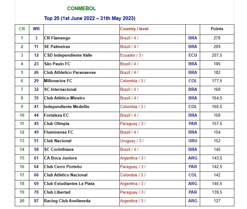 Curiosamente, River no aparece entre los 20 mejores clasificados de CONMEBOL y cayó desde el puesto 55 al 92 con tan solo 30 días de diferencia. En el medio pasó la eliminación ante Vélez por Libertadores y un flojo torneo en la recta final de 2022, pero lo cosechado por el equipo de Martín Demichelis seguramente le hará subir escalones en próximas publicaciones.