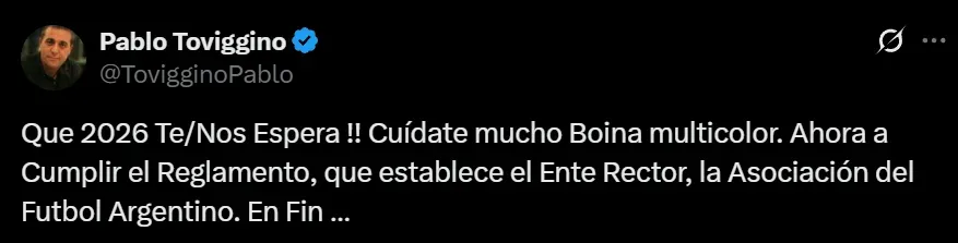 “¡¡Qué 2026 te/nos espera!! Cuídate mucho boina multicolor. Ahora a cumplir el reglamento que establece el ente rector, la Asociación del Fútbol Argentino. En Fin…”, escribió Pablo Toviggino para dar a conocer el comunicado en el que obliga a Estudiantes de La Plata a homenajear a Rosario Central por el título obtenido.