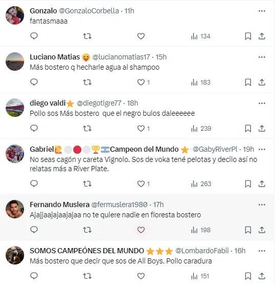 Tan solo un emoji de un corazón bastó para que le respondieran al periodista en sus redes sociales. “Querete un poco… decí la verdad”, “más bostero que echarle agua al shampoo”, “sos de Boca, tené pelotas y decilo”, fueron algunos de los comentarios crueles que aparecieron al pie de la publicación de Vignolo.