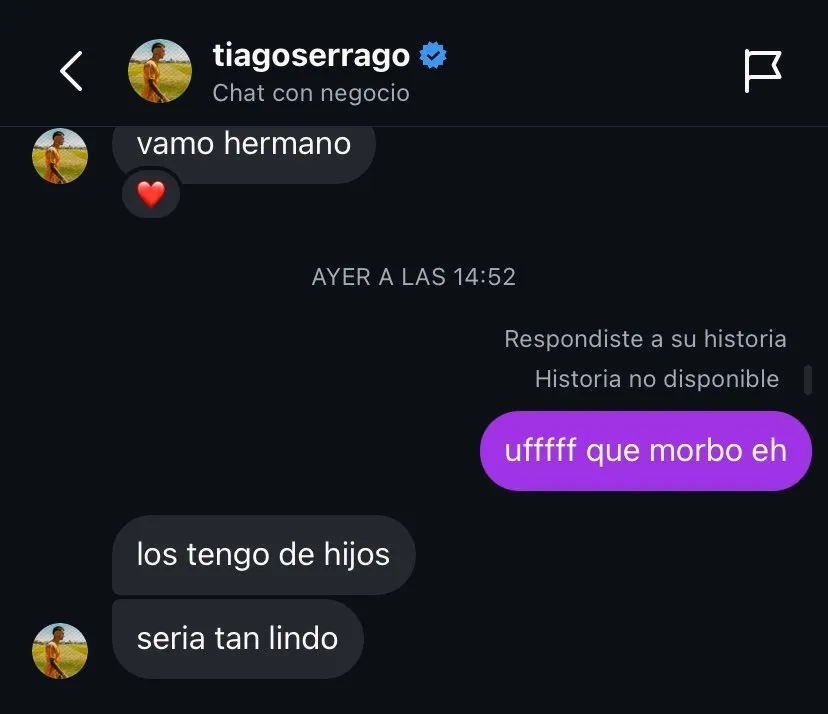 El usuario de X @pasionriverpl compartió el intercambio de mensajes en el que le deslizaron a Serrago sobre el inminente duelo ante Boca: “Uf, qué morbo eh”. Y el jugador de Aldosivi respondió: “Los tengo de hijos. Sería tan lindo”.