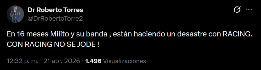 Estuvo a cargo del Departamento de Seguridad y también fue vocal, y ahora mira de reojo al presente dirigencial racinguista. Roberto Torres, por medio de sus redes sociales, disparó con munición muy pesada contra el Príncipe: “En 16 meses Milito y su banda, están haciendo un desastre con Racing. ¡Con Racing no se jode!“, expuso en su cuenta de X. Pero todo se agravó cuando, por medio de un estado de WhatsApp, redobló la apuesta.