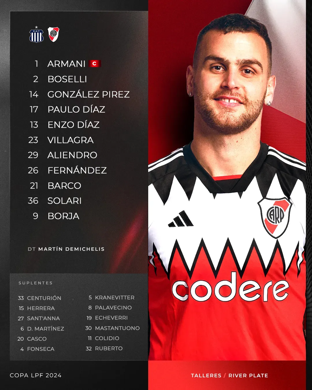 Con tres cambios con respecto al equipo que empató con Boca, el Millonario sale a la cancha con: Franco Armani; Sebastián Boselli, Leandro González Pirez, Paulo Díaz, Enzo Díaz; Rodrigo Aliendro, Rodrigo Villagra; Ignacio Fernández, Esequiel Barco; Pablo Solari y Miguel Borja.
