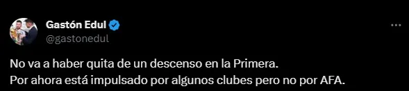 Según confirmó el periodista Gastón Edul en su cuenta personal de Twitter, esta idea de suspender un descenso nacería desde un grupo de clubes y no por parte de la AFA. Ante esto, la Asociación del Fútbol Argentino termina desechando la posibilidad.