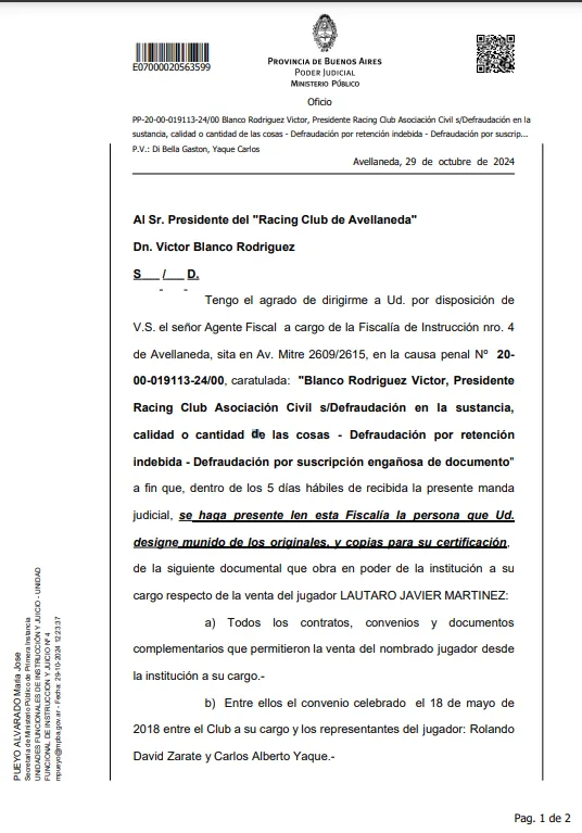 Víctor Blanco, quien era presidente de Racing en ese momento y lo sigue siendo hoy en día, fue llamado a presentarse en la Fiscalía de Instrucción número 4 de Avellaneda con la obligación de llevar documentación relacionada al traspaso.