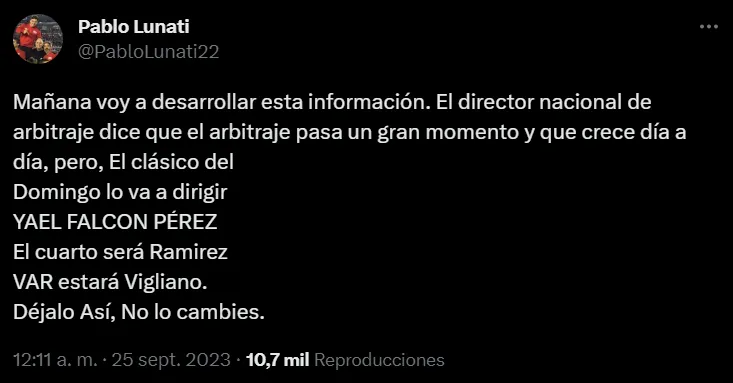 Por intermedio de su cuenta oficial de Twitter, Lunati fue categórico: “Mañana voy a desarrollar esta información. El director nacional de arbitraje dice que el arbitraje pasa un gran momento y crece día a día. Pero el clásico del domingo lo va a dirigir Yael Falcón Pérez. El cuarto será Ramírez. En el VAR estará Vigliano”, explotó el excolegiado.