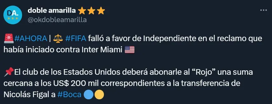 Ahora bien, en este caso, es Inter Miami quien perdió una instancia judicial que el Rojo elevó en FIFA. Resulta que al momento de que los norteamericanos vendieran a Nicolás Figal hacia Boca, no le abonaron la suma de 200 mil dólares a los de Avellaneda.