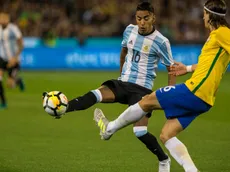 José Luis Gómez siendo marcado por Filipe Luis en su debut con Argentina ante Brasil (Getty Images).