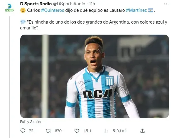 Con algo de suspenso, y una incógnita fácilmente de resolver, Quinteros se animó a enfrentar la pregunta de DSports Radio y sentenció: “Es hincha de uno de los dos grandes de Argentina, con colores azul y amarillo”. No hay que ser ningún detective para entender de lo que está hablando: ¿Lautaro siempre hinchó por Boca?