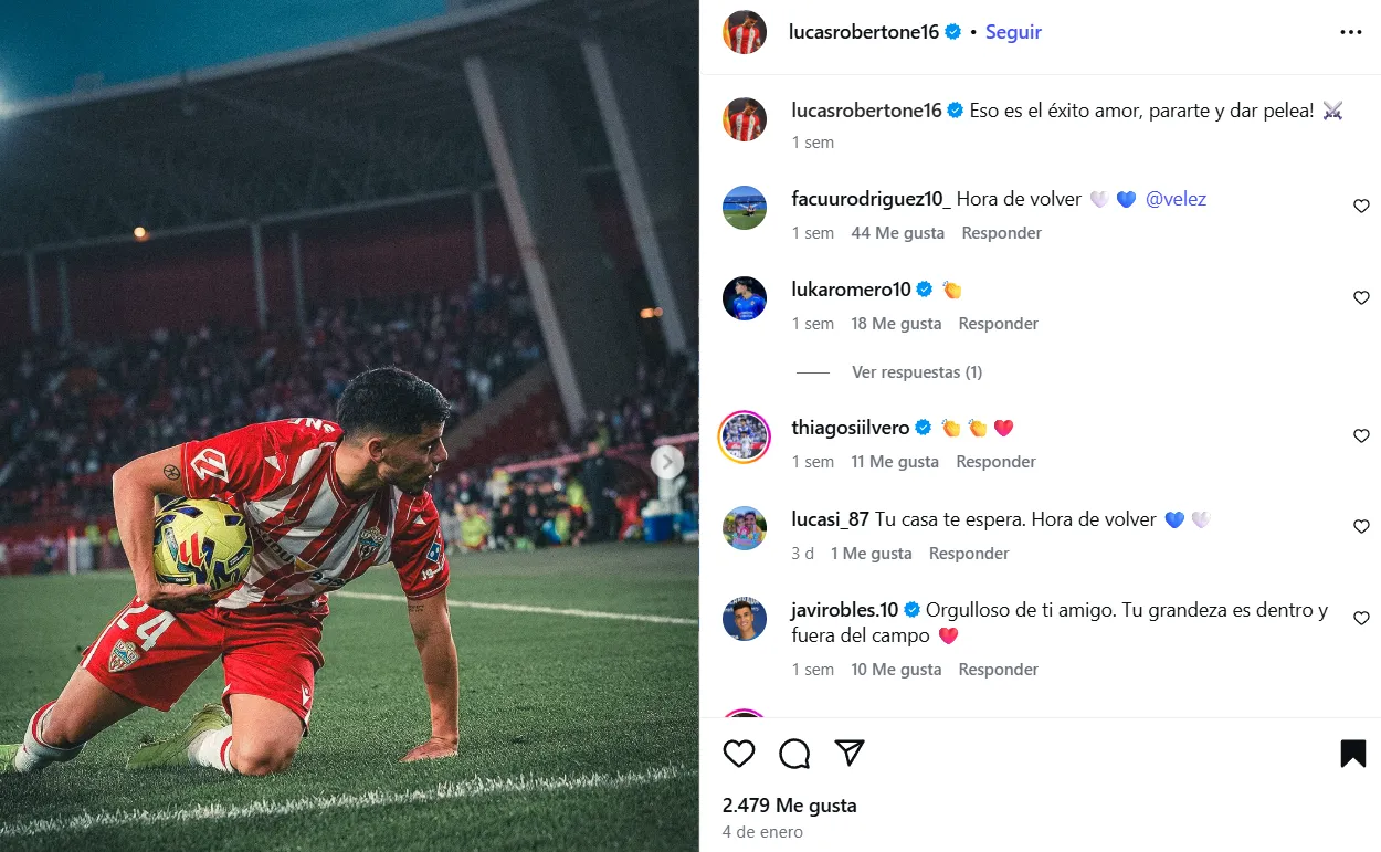 Si todo se da según lo previsto, Lucas Robertone habrá disputado su último partido con Almería el pasado sábado 3 de enero, después de una larguísima inactividad. Después de dicho encuentro y antes que se diera por hecho su regreso a Vélez, el jugador se había expresado en redes sociales por la oportunidad de volver a tener minutos.