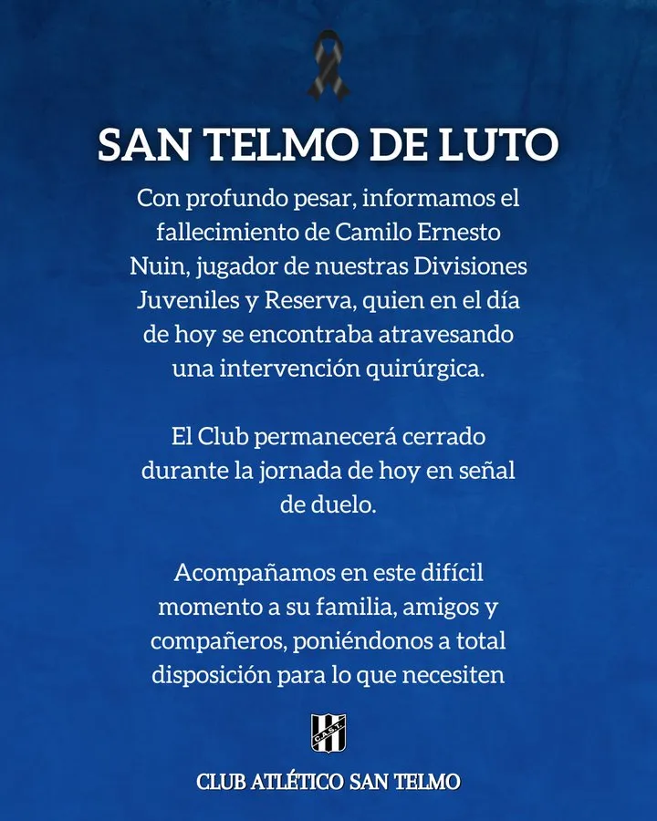 “La Comisión de Fútbol Juvenil e Infantil de AFA lamenta profundamente el fallecimiento de Camilo Ernesto Nuin, jugador juvenil del Club Atlético San Telmo. Nuestro mayor respeto a sus familiares, amigos. compañeros y a la Institución en este momento tan doloroso”, se expresó desde la cuenta oficial de la Asociación del Fútbol Argentino apenas se conoció la noticia de la muerte del futbolista.