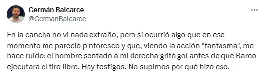 “En la cancha no vi nada extraño, pero sí ocurrió algo que en ese momento me pareció pintoresco y que, viendo la acción “fantasma”, me hace ruido: el hombre sentado a mi derecha gritó gol antes de que Barco ejecutara el tiro libre. Hay testigos. No supimos por qué hizo eso”, remató el editor de Revista 1986.