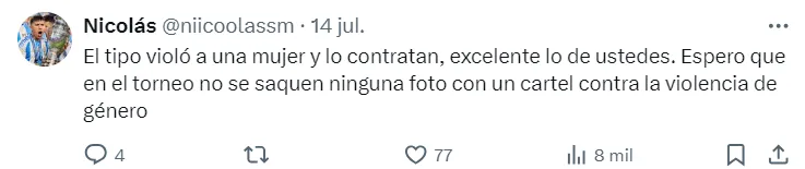 En diálogo con TN, una de las socias expresó: “Nos concentramos en la puerta del predio hinchas, socios y no socios en repudio a este refuerzo, que es Abiel Osorio. Es pública la causa que tiene por abuso sexual a una periodista deportiva en Tucumán.