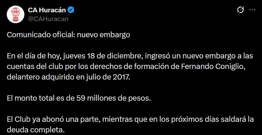 - Huracán sufrió un embargo este jueves 18 de diciembre por derechos de formación de Fernando Coniglio.