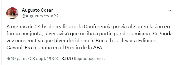 Acorde a lo que informa el periodista Augusto Cesar, a menos de 24 horas de llevarse a cabo la conferencia de prensa del Superclásico que se iba a realizar en el predio de AFA en Ezeiza, en la que iba a hablar Cavani por Boca, desde River avisaron que no iban a presentarse, por lo que fue suspendida.