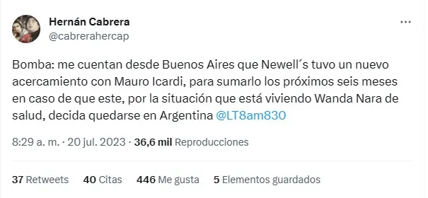 Con la necesidad de quedarse un tiempo más en territorio nacional para acompañar a Wanda en este difícil momento, Icardi podría continuar su carrera en el fútbol argentino. “Me cuentan desde Buenos Aires que Newell’s tuvo un nuevo acercamiento con Mauro Icardi, para sumarlo los próximos seis meses“, aseguró el periodista rosarino Hernán Cabrera para LT8 AM830.