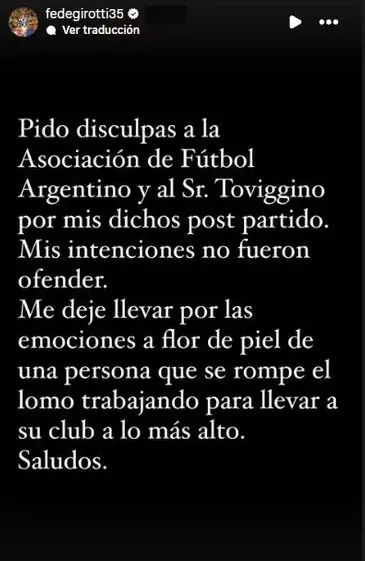 Sin embargo, el ex River decidió retractarse a los pocos días y lamentó sus dichos a través de un posteo en sus redes sociales. “Pido disculpas a la Asociación del Fútbol Argentino y al Sr. Toviggino por mis dichos post partido. Mis intenciones no fueron ofender. Me dejé llevar por las emociones a flor de piel de una persona que se rompe el lomo trabajando para llevar a su club a lo más alto. Saludos”, dice la publicación.